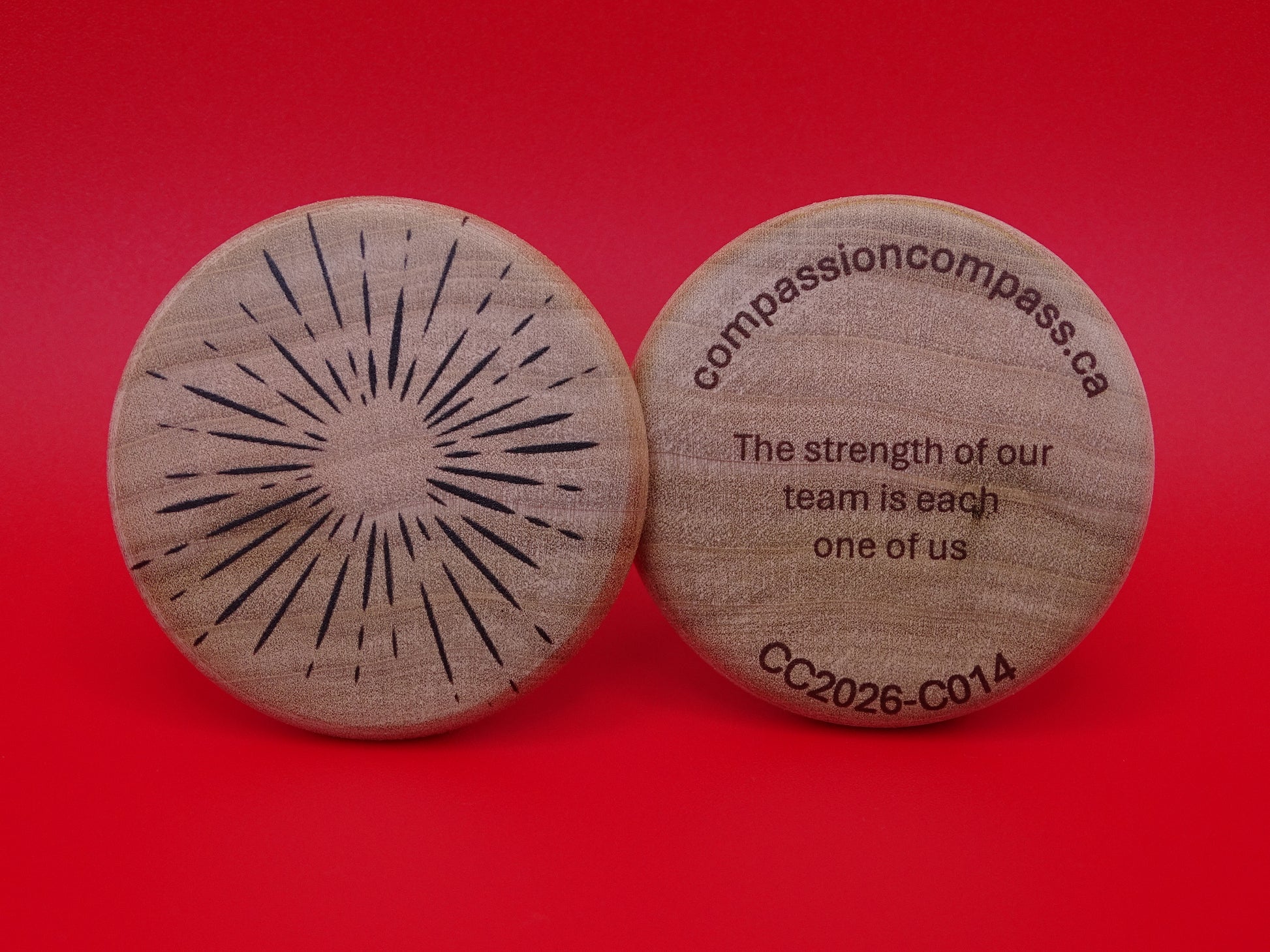Create a personalized wooden disc for your special occasion or corporate event. Whether you're celebrating a milestone, hosting a team-building event, or looking for meaningful corporate gifts, submit your custom design and we'll craft it onto a beautiful Compassion Compass.